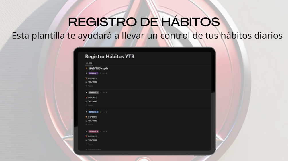 Está dividida en las 4 semanas que tiene un mes, con desplegable para que no te molesten el resto de semanas y tengas claro en que semana estás. Puedes añadir tantos nuevos hábitos como quieras a esta misma plantilla.